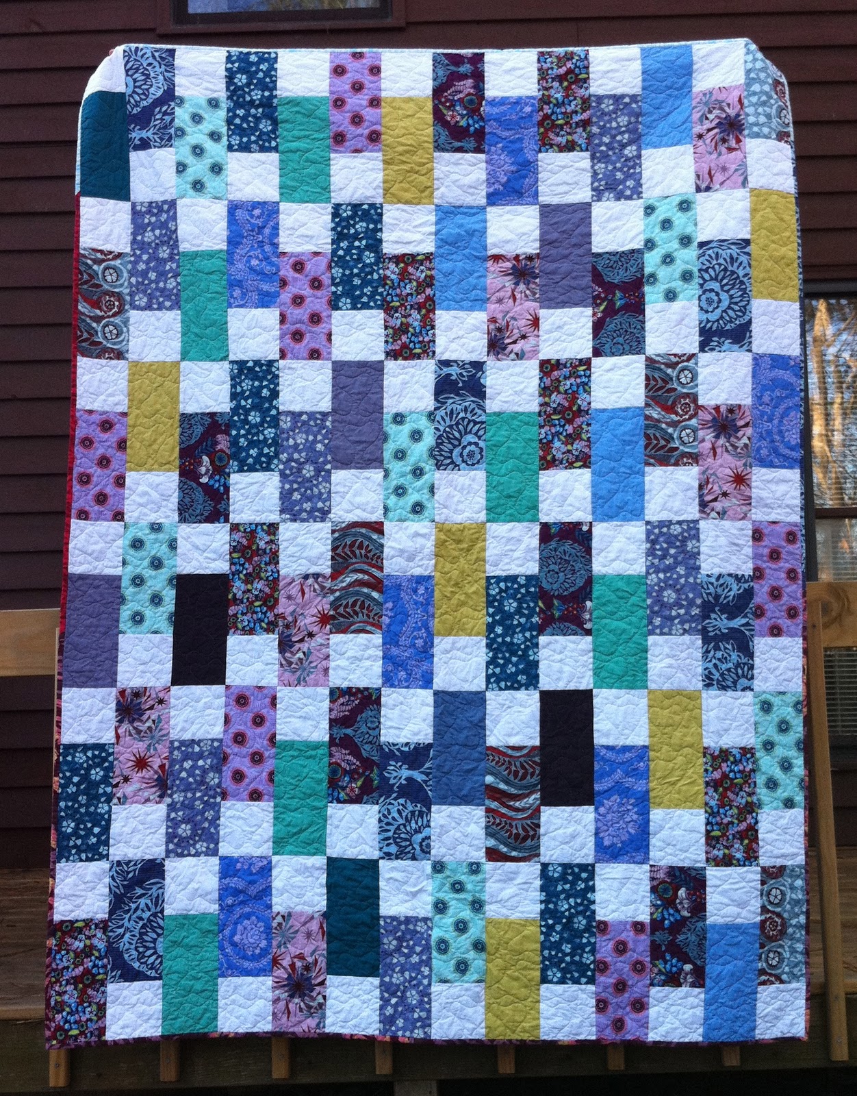 {Made mostly from Anna Maria Horner's Innocent Crush fabrics, using Amy Smart's Easy Strawberry Fields Brick Quilt featured over on Moda Bake Shop. It was the very first quilt I've ever sent off to a long-arm quilter, and I was quite pleased with the results.}